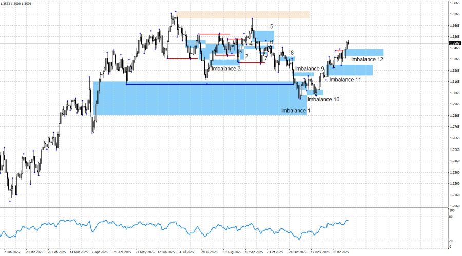 Пара GBP/USD выполнила отбой от «бычьего» имбаланса 11 и возобновила процесс роста, как я и предполагал. Реакция на «бычий» имбаланс 11 оказалась уже второй, первый один сигнал на покупку был получен еще на прошлой неделе. На данный момент сделки на покупку находятся в прибыли уже около 400 пипсов по скромным подсчетам, и трейдеры могут сами решать, что делать дальше. На мой взгляд, процесс роста британца будет продолжен. Однако завтра рынок закрыт, в пятницу, вероятно, мы не увидим никаких интересных движений.