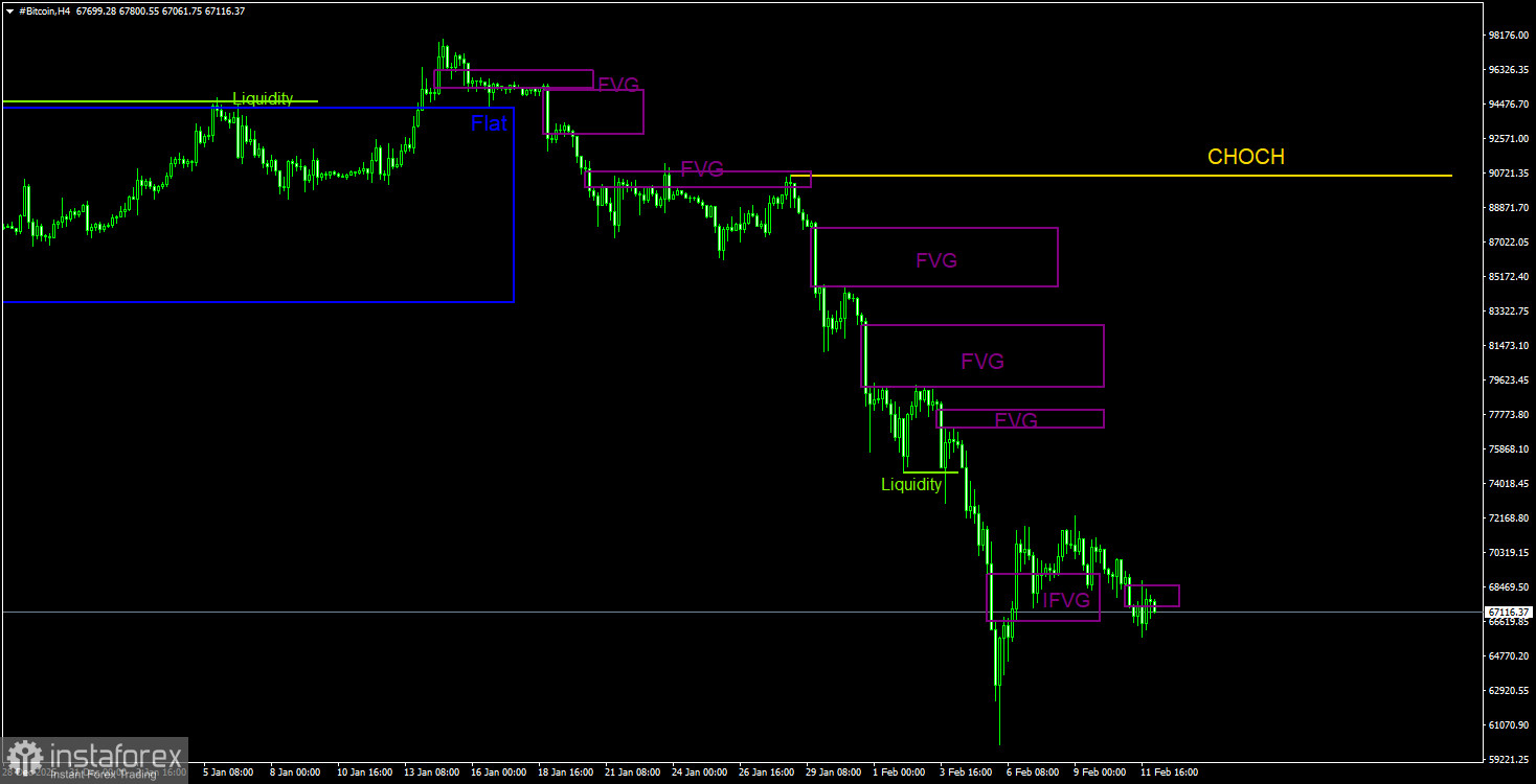Биткоин продолжает формирование полноценного нисходящего тренда. Мы продолжаем ожидать падения с целью 57 500$(уровень 61,8% по Фибоначчи от трехлетнего восходящего тренда), а признаков разворота тренда в данное время ни одного. Но даже уровень 57 500$ теперь не выглядит, как конечная остановка. Из областей POI на продажу на дневном ТФ можно отметить последний «медвежий» FVG, до которого биткоину еще очень далеко. На 4-часовом ТФ также имеется «медвежий» FVG. Реакция на любой из этих FVG + подтверждение на ТФ младше на два ранга = возможность открытия новых шортов.